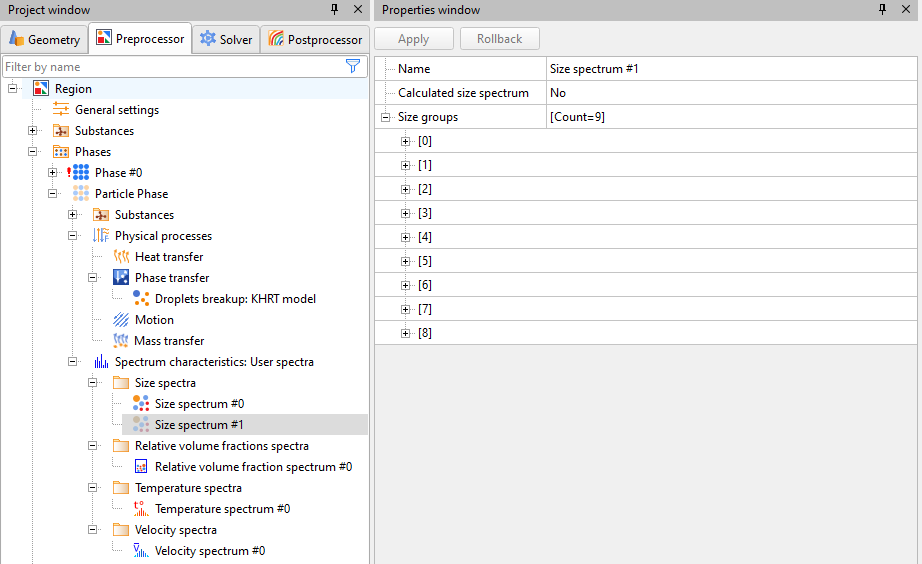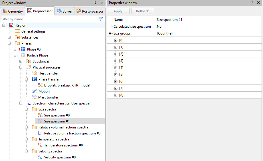 Particle modeling has been expanded to include spectra for parameters such as velocity, temperature, and volume fraction. Multiple spectra can be defined for use as boundary or initial conditions.